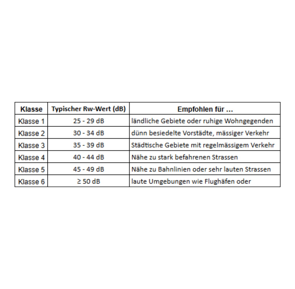Schallschutzfenster werden danach eingestuft, wie gut sie Aussengeräusche dämpfen. Grundlage dafür ist die Norm SIA 181, die mit den europäischen Richtlinien übereinstimmt. Entscheidend ist der sogenannte Rw-Wert – das gewichtete Schalldämmmass, gemessen in Dezibel (dB). Je höher dieser Wert, desto besser schützt das Fenster vor Lärm.